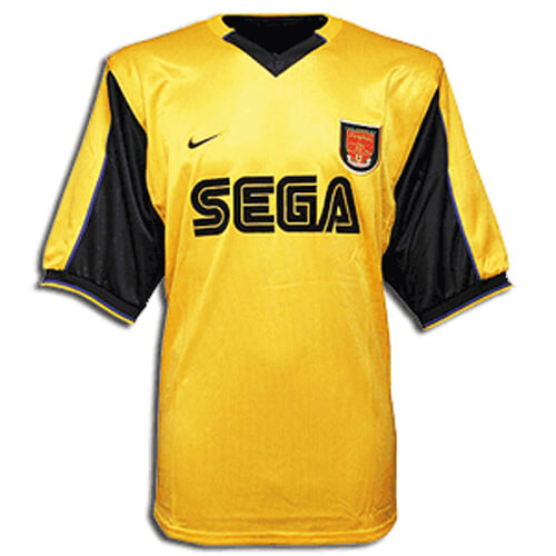 The Retro Arsenal Away Football Shirt 1999–2001 stands out as a distinctive piece from the turn of the millennium. Designed by , this shirt features a vibrant yellow body, navy blue sleeves and side panels, and the iconic SEGA sponsor emblazoned across the chest. This kit was worn during a pivotal period for Arsenal, marking the early stages of Thierry Henry’s illustrious career with the club.